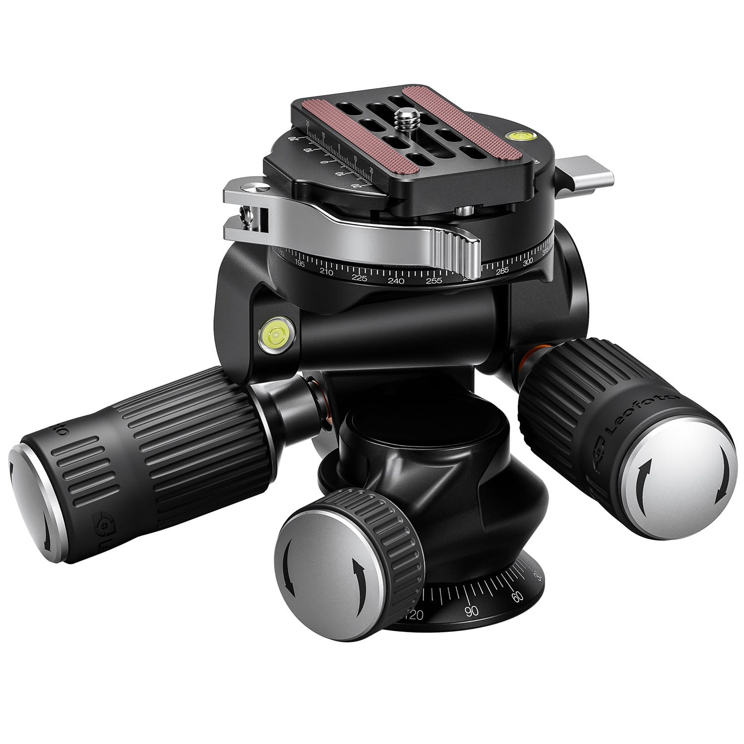Jede Achse ist separat einstellbar, was feinste Korrekturen in beide Richtungen erlaubt. Die Hebel für die vertikale Achse sowie für die Quer-/Hochformatverstellung lassen sich für den Transport um 38mm einschieben – das spart Platz und schützt vor Beschädigungen unterwegs. Ein separater 360° Panoramateller direkt unter der Kamera ermöglicht exakte Panoramaaufnahmen, unabhängig von der Stativausrichtung. Die Schnellwechselkupplung mit Klemmhebel ist Arca-Swiss-kompatibel und erlaubt schnellen Objektiv- oder Kameratausch ohne Einbussen bei der Stabilität.