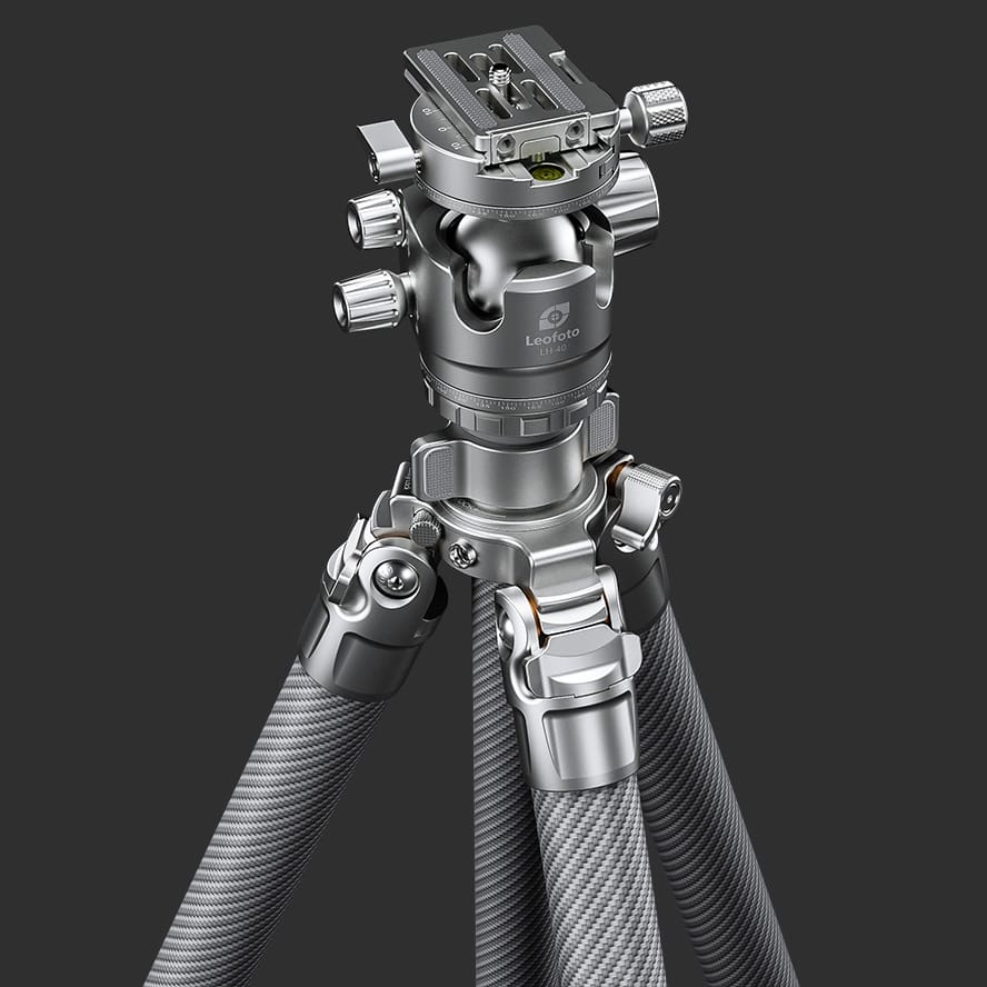 Die Mittelsäule besteht ebenfalls aus 10-Lagen-Carbon und ist ebenso im Komplett-Set dabei wie der Kugelkopf mit integrierter 360° Panorama-Kupplung. Auch ein Multi-Tool, ein Karabiner und ein Satz Titan-Spikes sind im Lieferumfang enthalten – alles zusammen wird in einer robusten Transporttasche geliefert. Das LG-324C verfügt zudem seitlich über zwei Norm-Gewindeanschlüsse – einen mit 1/4 Zoll Gewinde und eine mit 3/4 Zoll Gewinde. Somit kann der Dreibeiner mit Zubehör wie Smartphone, Blitz, Reflektor etc. erweitert werden.