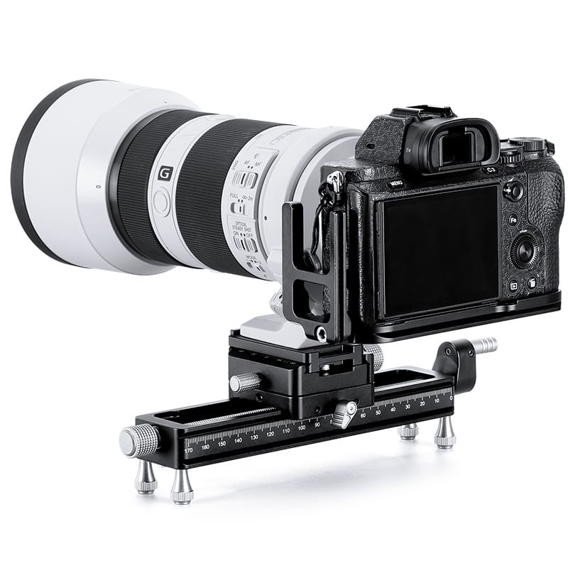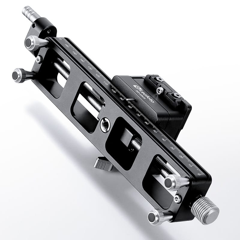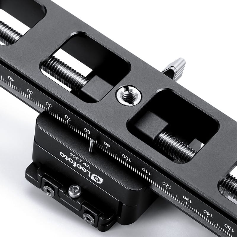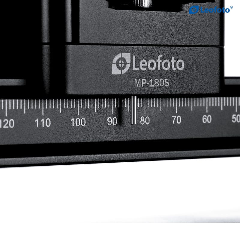 Der Makroschlitten MP-180S von Leofoto ist eine Präzisionsfokussiereinheit mit linearer Spindel, die eine Kameraplattform mit einem drehbaren Arca-Schnellspannsatz enthält. Die Schiene hat einen Verfahrweg von 170mm, wobei jede volle Umdrehung der Kurbel eine Bewegung von 1,25 mm für eine präzise Kamerapositionierung ermöglicht. Der Fokussierknopf hat eine Kurbel, die sich bequem flach zusammenklappen lässt. Die Schiene ist zur Gewichtsreduzierung ausgehöhlt, hat aber dennoch eine robuste Tragfähigkeit von 8kg. Die Schiene verfügt über vier abnehmbare, gummierte Füsse für einen sicheren Halt.