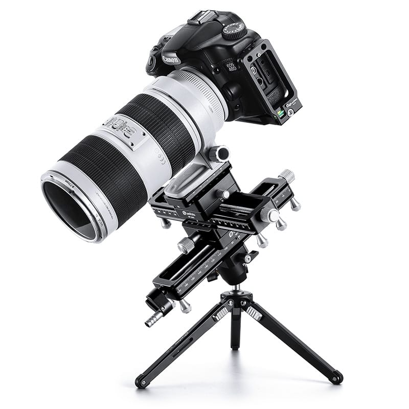Die um 360° drehbare Kameraplattform verfügt über einen Verriegelungshebel und eine Arca-Schnellspannklemme, die schnell in vier Positionen in 90°-Schritten gedreht werden kann. Die im Lieferumfang enthaltene NP-50-Schnellwechselplatte verfügt über Traktionspads, um Bewegungen zu verhindern sowie einen einstellbaren Anti-Twist-Flansch, um unerwünschte Bewegungen zwischen der Platte und dem Kameragehäuse zu vermeiden.